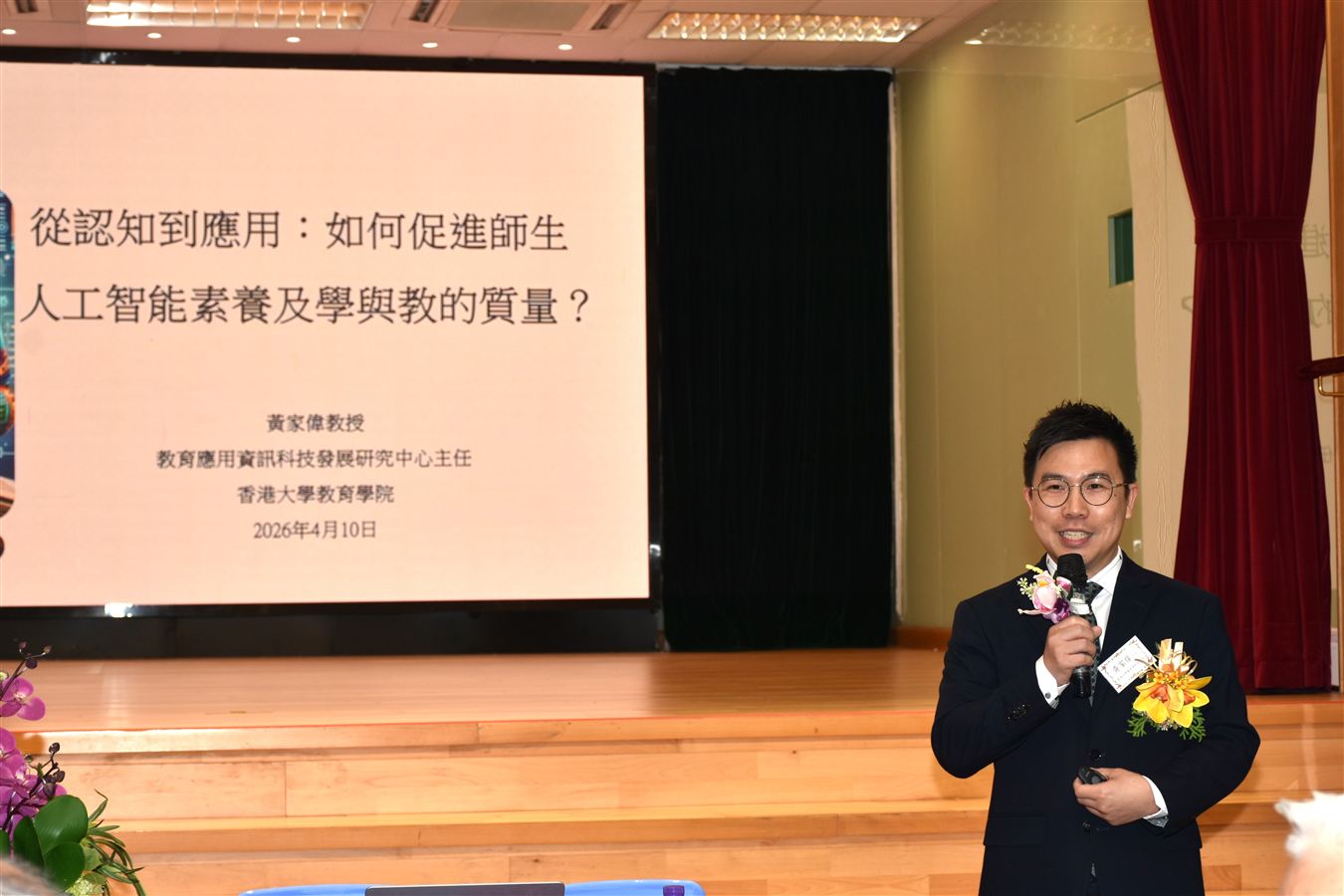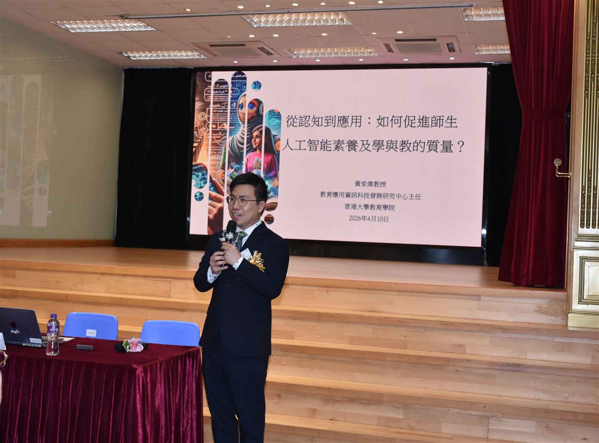 香港五邑工商總會於2026年4月10日舉行第二十一屆聯校教師專業發展日,為本會學校校長及老師提供專業培訓。今年本會邀得香港大學教育學院副教授黃家偉教授為我們分享講題「從認知到應用:如何促進師生人工智能素養及學與教的質量」。講座內容令在座的校董及教師深受啟迪,既深化對數字教育的認識,也對如何在教育崗位上推動相關理念也獲得了寶貴的啟示。